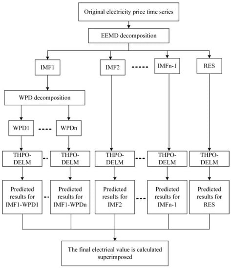 The proposed electricity price forecasting model in this study comprises three stages. Firstly, the original electricity price time series undergoes EEMD decomposition, and the IMF1 component with higher irregularity is further decomposed using WPD decomposition. Secondly, the THPO algorithm with adaptive t-distribution is introduced to optimize the input weights of the DELM. Thirdly, a THPO-DELM electricity price forecasting model is constructed for each series, and the final electricity price forecasts are obtained by superimposing the prediction results of each model. The specific modeling steps are illustrated in Figure 9.