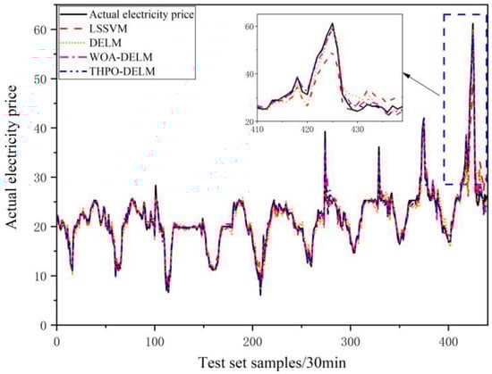 In order to verify the validity of the proposed THPO-DELM prediction model, the electricity price data were processed by quadratic mixture decomposition, and each series was predicted and then superimposed. The following prediction models were used: (1) LSSVM; (2) DELM; (3) WOA-DELM; and (4) THPO-DELM, and the final predicted values were obtained by superimposing the prediction results of each series. The prediction curves are shown in Figure 12, and the evaluation indicators are shown in Table 4.
