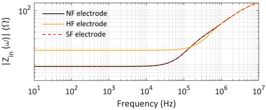 Figure 3. Comparison between the magnitude of the input impedance computed for a grounding electrode without defect (NF) and for electrodes with soft (SF) and hard (HF) series faults.