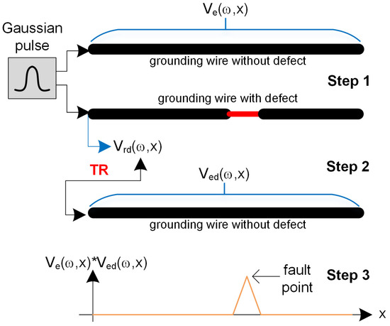 In the second step, the reflected signal V r d ω is time-reversed and back-injected through numerical simulation into the grounding electrode without a defect. In the frequency domain, the TR operator is represented by the complex conjugate of the Fourier transform of the signal. Then, the spatial voltage distribution V e d ω , x along the electrode in response to V r d * ω , where * denotes the complex conjugate operator, is numerically computed.