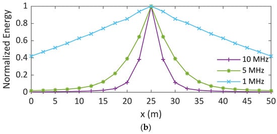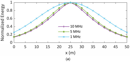 Figure 6. Normalized energy as a function of the position along the electrode considering the injection of Gaussian pulses of different frequencies and soil conductivities of (a) 4 mS/m and (b) 0.4 mS/m.