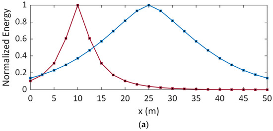 Figure 7. Normalized energy as a function of the position along the electrode considering distinct locations of the hard fault and soil conductivities of (a) 4 mS/m and (b) 0.4 mS/m. Red curve (defect at x = 10 m), blue curve (defect at x = 25 m).