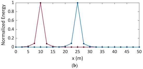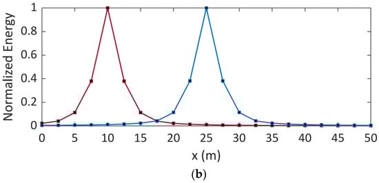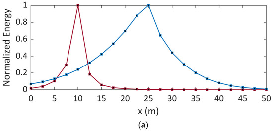 Figure 8. Normalized energy as a function of the position along the electrode considering distinct locations of the soft fault and soil conductivities of (a) 4 mS/m and (b) 0.4 mS/m. Red curve (defect at x = 10 m), blue curve (defect at x = 25 m).