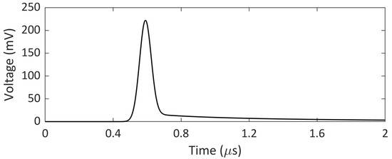 In the first step, a voltage Gaussian pulse is applied to the left end of the electrode without a defect, and the spatial voltage distribution V e ω , x along the electrode is computed using the model based on the TL theory described in Section 2. The same Gaussian pulse is applied to the electrode with a defect and the reflected signal V r d ω is determined. The latter signal is generally obtained through a measurement on the potentially faulty grounding electrode under test. It is worth noting that the reflection coming from the open end of the electrode can be filtered out knowing the electrode length.