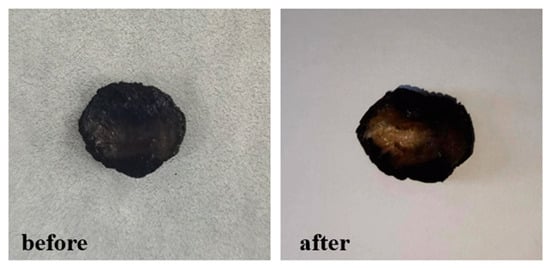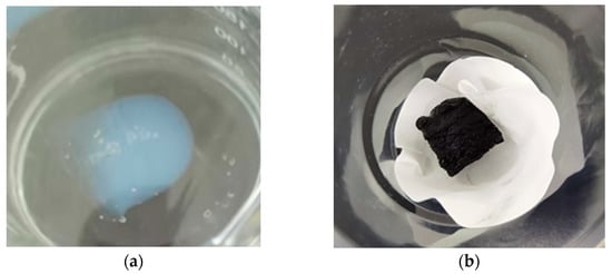 The quality changes of the 1 mm (a), 1.5 mm (b), and 2 mm (c) PNIPAm/PPy hydrogels before and after hygroscopy are shown in Figure 10 and Table 4, and the appearance quality of PNIPAm/PPy is shown in Figure 10. As can be seen from Table 4, the moisture absorption amount barely decreased. Although the mass of the 2 mm PNIPAm/PPy hydrogel decreased by 0.0001 g on its 20th use, we believe that the mass has not changed due to the error of the balance being ±0.0002 g. Figure 11 shows the material after its 20th use. The density of the material does not change. Although the mass of the 2 mm PNIPAm/PPy hydrogel decreased by 0.0001 g on its 20th use, this is a statistically insignificant difference. Thus, PNIPAm/PPy has good regeneration performance and can be reused multiple times.