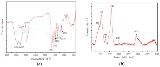 Figure 2 shows the infrared and Raman spectra of PNIPAm/PPy. A strong absorption peak appears at 3430 cm−1, which corresponds to the stretching vibration peak of the –NH functional group in the PNIPAm hydrogel. The strongest absorption peak appears at 1640 cm−1, which corresponds to C=O in the PNIPAm gel, and an absorption peak with a lower intensity appears at 1170 cm−1, which is caused by the stretching vibration of the C–C skeleton in the isopropyl group in the PNIPAM gel. Accordingly, it can be inferred that there are hydrophilic amide groups—CONH—and hydrophobic isopropyl groups—CH (CH3)2—in the PNIPAm gel molecule. At the same time, there is a weak absorption peak at 3120 cm−1, indicating the presence of a small amount of =C–H in the product, which, in turn, indicates that the monomer reaction yields PNIPAm. The wide peak at 3330 cm−1 in Figure 2 is caused by the N–H stretching vibration of the pyrrole ring, and it partially overlaps the stretching vibration peak of the N–H functional group in the PNIPAm hydrogel. The characteristic peak at 1550 cm−1 is attributed to the stretching of the C=C double bond. The weak peaks at 1460 cm−1 and 1170 cm−1 represent the plane deformations of C–N and C–H bonds, respectively. In addition, the peak generated at 1130 cm−1 can be attributed to the stretching of the C–C bond.