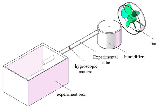 A schematic diagram of the experimental bench is shown in Figure 3. The main experimental instruments are shown in Table 2. In the diagram, the enclosed test box simulates the closed space of a building, and the hygroscopic material is placed in the test tube. A humidifier with adjustable humidity is used to humidify the air, and the fan sends the wet air into the test tube. A temperature and humidity sensor is used to measure and control the set temperature and humidity.