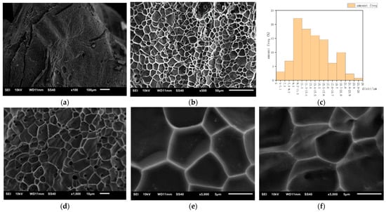 SEM images and histogram of pore size distribution of hydrogel at different magnifications. (a) PNIPAm/PPy magnified 100 times. (b) PNIPAm/PPy magnified 500 times. (c) Pore size distribution histogram of PNIPAm/PPy. (d) PNIPAm/PPy magnified 1000 times. (e) PNIPAm/PPy magnified 5000 times. (f) PNIPAm/PPy magnified 5000 times.