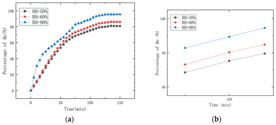 Moisture content variation represented by the percentage of the corresponding saturated water content () of each sample over time. (a) Moisture absorption performance changes of PNIPAm/PPy with different RH values within 0–150 min. (b) Moisture absorption performance changes of PNIPAm/PPy with different RH values at 70, 75, and 80 min.