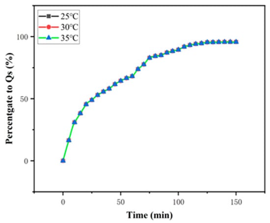 Traditional porous hygroscopic materials are sensitive to temperature adsorption because the diffusion of water vapor from the air into a nanopore is the rate-determining step. To verify the different moisture-capturing mechanisms of PNIPAm/PPy under different temperatures, the experimental temperatures were set as 25 °C, 30 °C, and 35 °C, with the other conditions remaining the same. As shown in Figure 6, the experimental curves almost coincide at the temperatures of 25 °C, 30 °C, and 35 °C. The results show that the hygroscopicity of PNIPAm/PPy was almost independent of temperature when the temperature was below 40 °C, which means that in terms of the application conditions of building air-conditioning systems, PNIPAm/PPy shows steady hygroscopicity.
