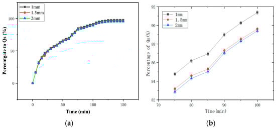 As shown in Figure 7a,b, under the same operating conditions, the 1 mm, 1.5 mm, and 2 mm PNIPAm/PPy samples were subjected to moisture absorption. As shown in Figure 6, at 90 min, the moisture absorption efficiencies were 89.01%, 87.31%, and 87.07%, respectively. The experimental results showed that thickness had a certain effect on the moisture absorption performance of PNIPAm/PPy. The lower the thickness, the higher the moisture absorption efficiency. However, the variations show overall similarity.