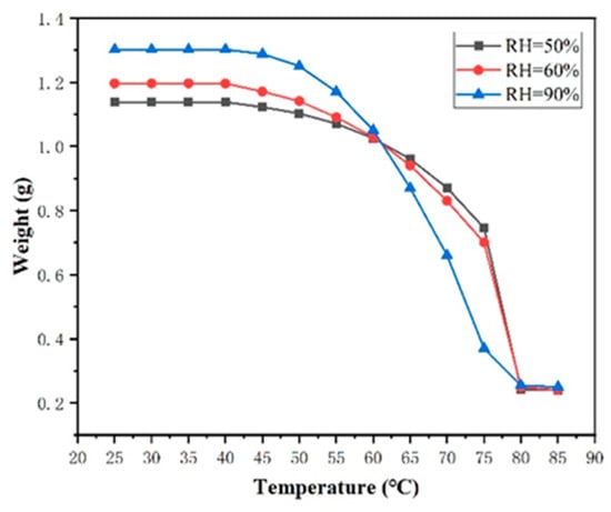 As mentioned in the main text, different relative humidities have a certain influence on the amount of water desorbed. As shown in Figure 9, the complete desorption times of the PNIPAm/PPy hydrogel at 45 °C, 50 °C, 60 °C, 70 °C, and 80 °C were 300 min, 220 min, 150 min, 100 min, and 60 min, respectively. The results show that the higher the temperature, the higher the desorption amount and the faster the desorption rate.