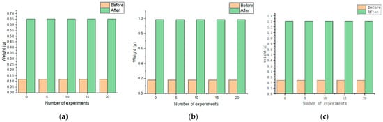 Three sets of data were tested, and the average values were considered to be the final values. As shown in Table 3 and Figure 5, the maximum error between the three sets of data and the average value is approximately within ±0.0002 g, and the error of the electronic balance is ±0.0002 g. Upon comparing the two errors, we consider the error of the electronic balance to be greater than or equal to the measurement error. The error line is almost invisible in Figure 5a, which has no impact on the trend of the curve; even if a portion of the data captured in Figure 5b is magnified, the error line is not obvious. Therefore, we will no longer emphasize the error line in the following text.