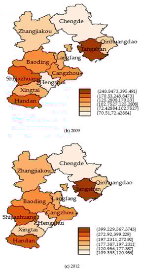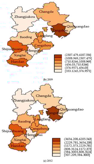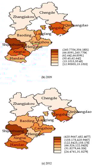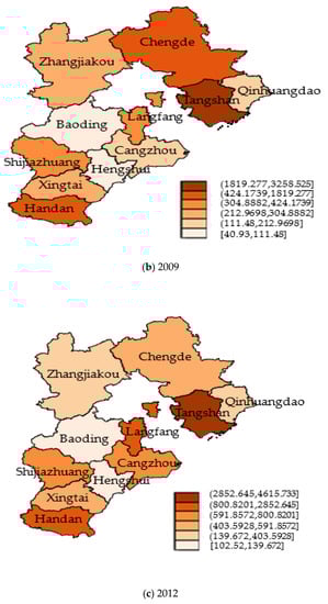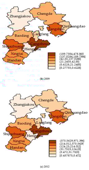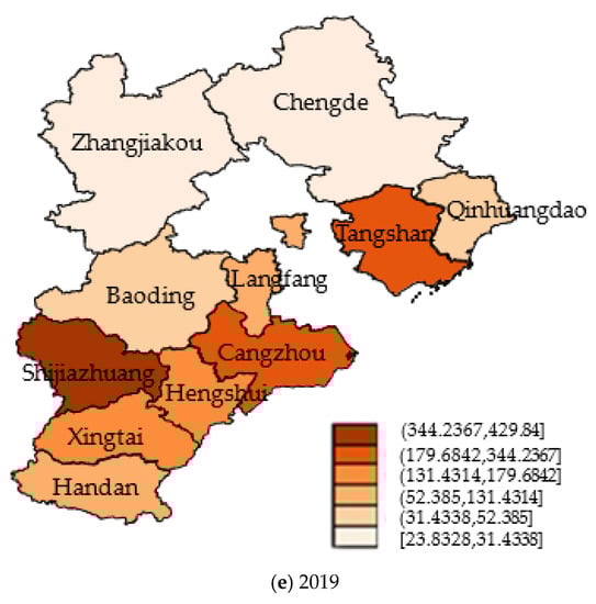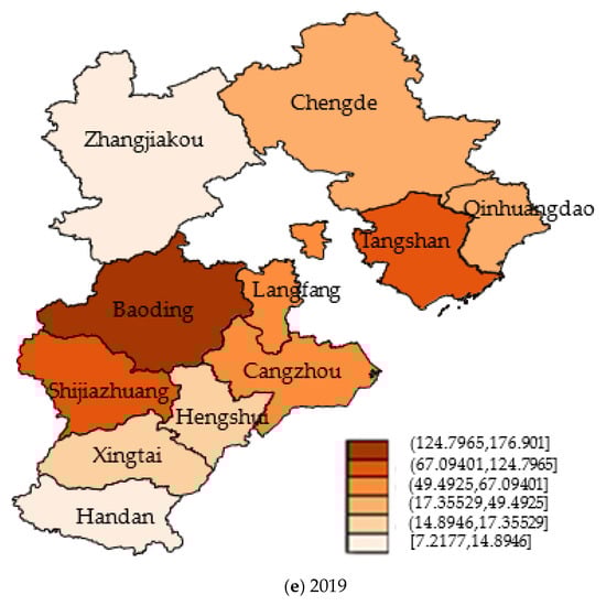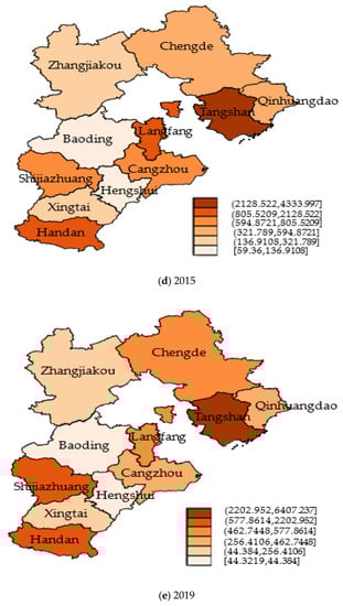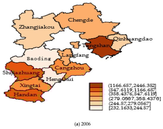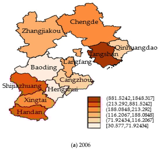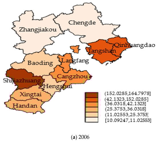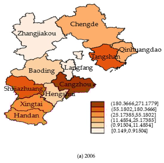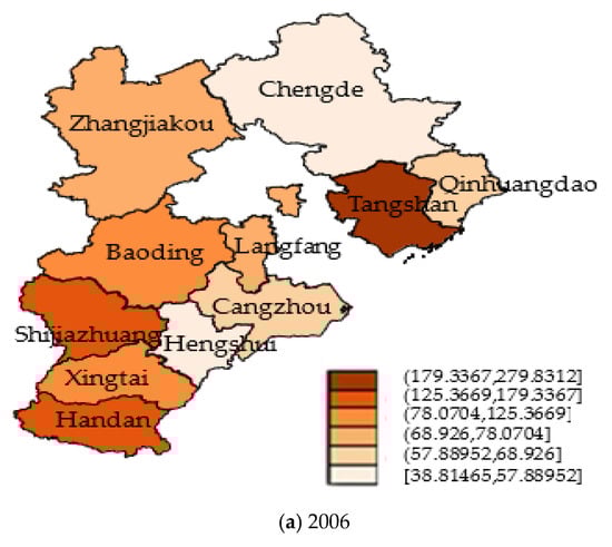 In Figure 1, 11 prefecture-level cities in Hebei Province are categorized into six levels in line with the gross industrial output value of APIISTPI. The deepest color represents the densest distribution of APIISTPI. As the color becomes lighter, the intensity of APIISTPI weakens. In 13 years, from 2006 to 2019, Tangshan produced the highest gross industrial output value of APIISTPI, and Shijiazhuang and Handan stayed in the second gradient. Tangshan adjoins the suburbs of Beijing. By dint of favorable geographical location and abundant natural resources, Tangshan undertakes the transfer of a large number of APIISTPI from Beijing, with a relatively high gross industrial output value. Since 2010, Tangshan has accelerated the adjustment of its industrial structure. Concerning the industrial added value of enterprises above designated size, six industries, i.e., steel and iron, building material, energy, chemical engineering, coking and thermal power, have achieved an added value of 137.832 billion yuan, with a year-on-year increase of 8.7%. As the capital of Hebei Province, Shijiazhuang attracts a good deal of funds and talent. In addition, advanced railway transportation ensures an adequate supply of raw materials and fuels for APIISTPI. Therefore, Shijiazhuang has stood in the second gradient. Located in the south of Hebei Province, Handan possesses rich natural resources for relevant industries. It has been an old resource-based industrial base in Hebei Province and an important production base for metallurgy, coal, power, textiles, ceramic and building material industries in China.