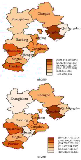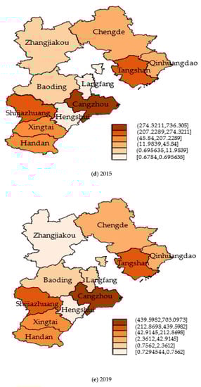 As Figure 5 shows, from 2006 to 2019, the spatial distribution color of Cangzhou embodied the deepest color. The main reason was that in 2000, the petroleum processing industry developed slowly in Hebei. Noticeably, the advantage of the port facilitated the development of the petroleum industry in Cangzhou. According to the data, in 2015, leading industries in Cangzhou, e.g., petrochemical, pipeline equipment, metallurgy, mechanical manufacturing, textiles, clothing and food processing, achieved an industrial added value of 107.21 billion yuan, accounting for 85.3% of enterprises above designated size in Cangzhou, with an increase of 7.2%. Particularly, the petrochemical industry realized an industrial-added value of 34.37 billion yuan, accounting for the highest proportion of 27.3%. In 2017, the industrial added value increased by 3% vis-à-vis 2015. That is mainly because, in the mid-and long-term development plan for the oil refining industry, China advocates and guides the transfer of resource-based industries from resource-based cities to coastal areas with huge market demands and favorable conditions for the import of raw materials.