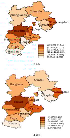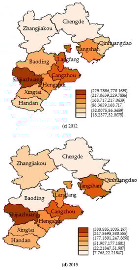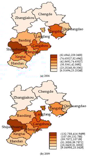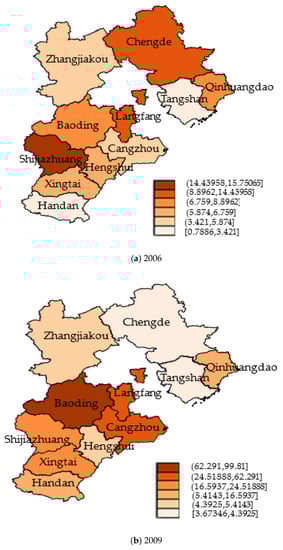 As Figure 6 shows, from 2006 to 2019, the spatial distribution of Shijiazhuang and Tangshan embodied deeper colors. Since 2006, the spatial distribution of Hengshui has displayed a trend of industrial agglomeration. After 2005, under the influence of national macro-control, the entire cement industry fluctuated wildly. In Tangshan, the industrial agglomeration of the cement industry diminishes. FRP products in Hengshui have a high market share nationwide. At the end of 2004, the production capacity was discontinued for the sake of environmental protection in Hengshui, resulting in a decrease in marginal supply in 2005. As environmental protection was upgraded and environmental supervision was tightened, the industrial agglomeration of the glass industry continued to decrease. In the ‘10th Five-Year Plan’, industrial resources were optimized with policy support.