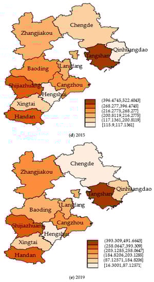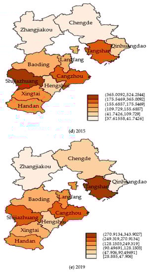 As Figure 7 shows, from 2006 to 2019, the spatial distribution of Zhangjiakou changed from deep to light. The spatial distribution of Handan embodied deeper color with a high level of industrial agglomeration. The spatial distribution of Tangshan embodied the deepest color, showing a high level of industrial agglomeration. In 2005, the spatial distribution shifted from Zhangjiakou and Handan to Tangshan and formed industrial agglomeration. This trend continued until 2017. There are multiple reasons. In the ‘10th Five-Year Plan’, the domestic steel and iron market continued to thrive, and China introduced a series of policies so that the craze for the export of steel material would wear off. Urged by The Policies on the Development of the Steel and Iron Industry, Zhangjiakou swiftly eliminated outdated production capacity, formulated the standards for steel and iron energy consumption, and supervised energy conservation and emission reduction. Many small and medium-sized enterprises had to be closed, converted or restructured.