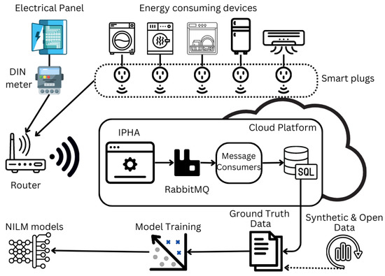 The energy disaggregation pipeline presented in this paper has been developed and successfully used for the purposes of the Heart Project. Heart includes a methodological collection of data (ground truth) from energy-consuming household appliances of interest, as well as the collection of data on the overall consumption of household installations. This has been achieved by the use of IoT devices, smart plugs, and a specialized cloud platform, which have been developed in the framework of Heart, where the collected data are stored. The data collection architecture is presented in Figure 1. Further analysis of the whole data collection pipeline is out of the scope of this work.