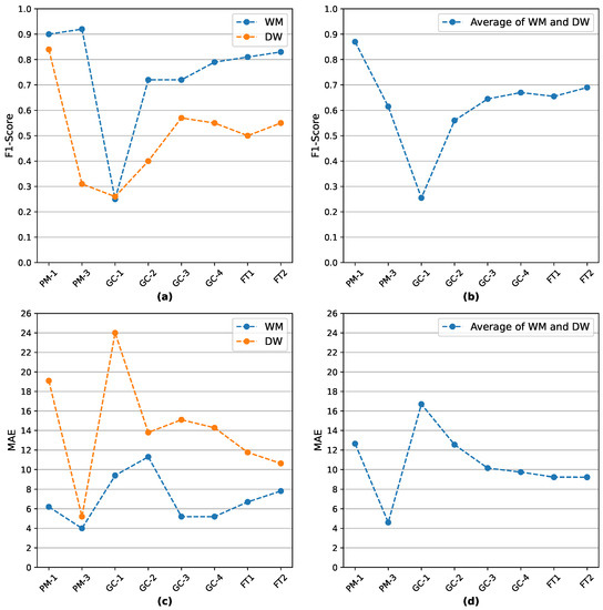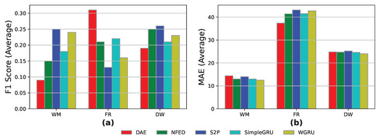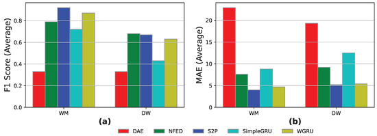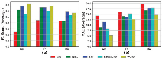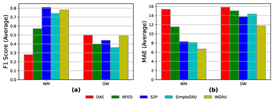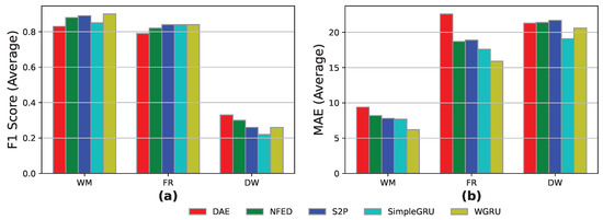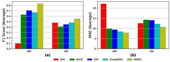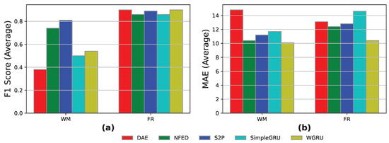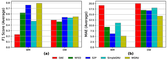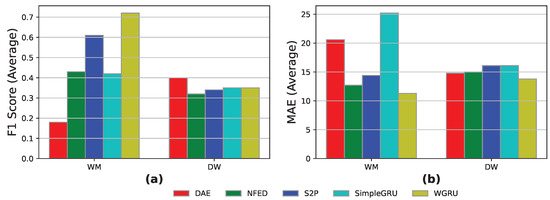PM-2 results for the models DAE, NFED, S2P, SimpleGRU, and WGRU for the WM and the FR utilizing Heart 1 household for training and inference: (a,b) F1-score and MAE results.