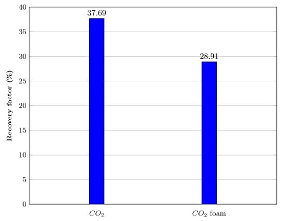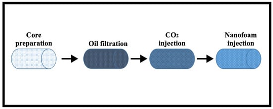 - Stage IV—Finally, nanofluid (low salinity brine + 0.3 wt.% AOS surfactant + 0.1 wt.% silica nanoparticles) and were injected as foam until a stable recovery factor was obtained, and then, the injection rate was increased.