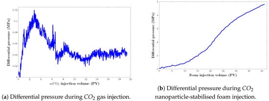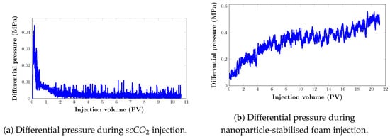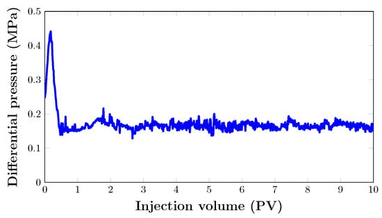 - Stage II—To achieve irreducible water saturation, the filtration experiment began with the injection of oil. The injection process was repeated until the differential pressure stabilised. During oil filtration, thermobaric conditions (temperature of 38 °C and pressure of 20.8 MPa) were created by replacing the decane in the core sample with a recombined model of the reservoir oil.
