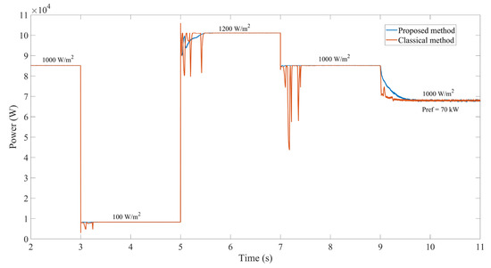 The proposed characteristic curve-fitting method significantly reduces overshoots by approximately 80% and 95% when the irradiance transitions from 100 to 1200 and 1200 to 1000 , respectively. The duration is curtailed by about 36%, 78%, and 80% under different test conditions. The results indicate that the proposed method shows better transition performances since significantly fewer disturbances are observed and smoother PV power curves are obtained, especially in the MPPT scenarios. Furthermore, it is worth noting that in our test, for fairness, both methods took the same sample time of 0.02 s, which is the limit for the classical method. If the sample time for the classical method is reduced to 0.01 s, the control performance becomes unacceptable, while the proposed characteristic curve-fitting method can tolerate shorter sampling intervals to further expedite the convergence rate.