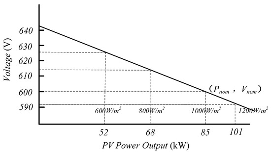In this section, the traditional V-I droop strategy is modified to V-P droop control for PV sources to provide primary voltage control. Unlike traditional voltage sources composed of energy storage or DC/AC converter back to the utility grid, (1) there is an upper power limit for the primary source restrictions and (2) the MAPP varies with irradiation and temperature, which requires the droop strategy to be adaptive to various operation conditions.