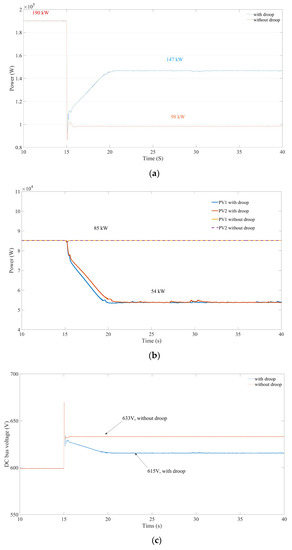 Figure 7 indicate that all the PV sources, in conjunction with the system storage, collectively mitigate the power imbalance due to a sudden load change. After 15 s, each PV source gradually reduces its output power by 31 kW, while the system storage only decreases its output power by about 43 kW. Consequently, the DC-bus voltage only ascends to 615 V. Using the proposed DVR strategy results in a power fluctuation of 53.3% in the battery and a voltage deviation decrease of 54.5%, thereby verifying the effectiveness of the proposed strategy in primary voltage regulation.