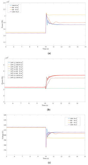 In this case, Load 2# (5 Ω), representing 23% of the system load in scenario 5.2, is initially offline and reconnected at 15 s. The simulation results under the four different irradiations (
