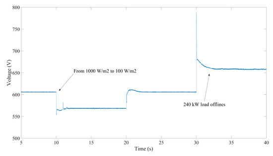 , maintaining the DC-bus voltage at 606 V. At 10 s, the irradiance abruptly decreases to 100