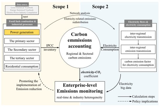 Previous studies have basically established regional/industry-level and near real-time emissions monitoring systems but have not yet expanded to more micro-enterprise entities. Moreover, there is still a certain distance between the existing carbon emission accounting system and the carbon emissions monitoring system. The former focuses on the fairness and efficiency of carbon emission responsibility distribution and, therefore, has derived three types of accounting scope, Scope1–Scope3, while the later focuses more on the expansion of the accuracy of spatial and temporal resolution and usually only focuses on Scope 1 or only homogenizes the brief treatment of electricity carbon emissions in Scope 2, blurring the responsibility transfer contained in the carbon emission stream. In summary, this study further optimizes the carbon emissions monitoring model in terms of measurement accuracy and scope, and the main contributions are as follows:
