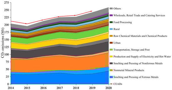 In terms of direct carbon emissions by sector (fossil energy combustion and industrial processes), there are large differences between the emission characteristics of each sector from 2014 to 2020. The industries of nonmetal mineral products, smelting and pressing of ferrous metals, and smelting and pressing of nonferrous metals are the most important sources of carbon emissions in Guangxi, generating 49.13 Mt, 43.69 Mt, and 31.33 Mt of direct carbon emissions in 2020, accounting for 26.83%, 23.76%, and 17.04% of the total direct emissions in Guangxi, respectively. Transportation, storage, and post is another major emitting sector of direct carbon emissions in Guangxi, with its CO2 emissions rising year by year from 17.27 Mt in 2014 to 20.58 Mt in 2018, with an average annual growth rate of 4.50%. Direct carbon emissions from the energy supply sector flow to other consumption sectors under the Scope 2 accounting principle, resulting in 17.54 Mt or 9.54% of the whole society. In addition, the emissions and shares of the primary industry, manufacturing, and rural residential consumption in Guangxi showed a downward trend during the study period, with direct carbon emissions from agriculture, forestry, animal husbandry, and the fishery declining from 3.43 Mt in 2016 to 2.35 Mt in 2019, with an average decline rate of 11.05%.
