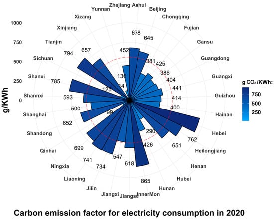 Once the above results are obtained, the carbon emissions implicit in the electricity consumption in each region and the corresponding carbon emission factors can be calculated. The in Equation (13) is an n-dimensional row vector representing the implicit carbon emissions from electricity consumption in each region. The in Equation (14) is an n-dimensional row vector representing the CO2 emission factor for electricity used in region j.