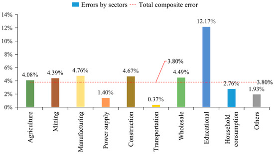 Prediction errors of electricity–CO2 coefficient (trend extrapolation). Note: the total composite error is the emissions-weighted average of the sectoral forecast error. Agriculture (agriculture, forestry, animal products, and fishing), power supply (production and supply of electricity, gas, and water), transportation (transportation, storage, and post), education (cultural, educational, and sports articles).