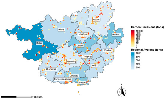 Real-time carbon emissions monitoring map of Guangxi in 2022. Note: the figure shows the carbon emissions monitoring values of some representative enterprises in Guangxi on a sample day.