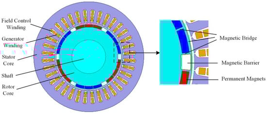 The SFC-PMSSG is a radial flux permanent magnet synchronous motor and is shown in Figure 1. The stator of the SFC-PMSSG is arranged with two sets of windings: generator winding and field control winding. The generator winding is connected to the rectifier and can provide power to the airborne equipment. The field control winding is connected with the FC to control the air gap magnetic field of the motor and adjust the output voltage of the generator winding during the generating stage. It is connected with the drive to start the engine during the starting stage. The rotor of the SFC-PMSSG is the IPM rotor, which has a better field control effect and a more reliable structure. The segmented permanent magnet is used to increase the direct-axis inductance and improve the magnetic weakening ability. However, the segmented permanent magnet increases the magnetic leakage and reduces the utilization rate of the permanent magnet. The magnetic barrier is set between the permanent magnets of two poles to reduce the magnetic leakage.