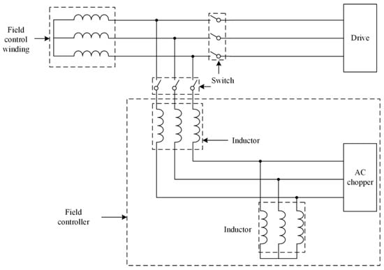 The FC is mainly composed of the AC chopper and the inductor, and its structure is shown in Figure 2. The principle of the FC is to use the armature reaction of the field control winding to weaken the magnetic field. Rotor position detection and vector control are not required in this process. In the generating stage, the field control winding is connected with the FC by turning the switch, and the field control winding generates a demagnetization current. The current of the field control winding is controlled by adjusting the duty cycle of the switching device in the AC chopper.
