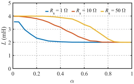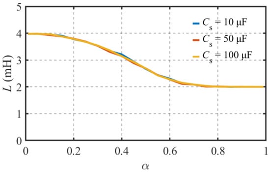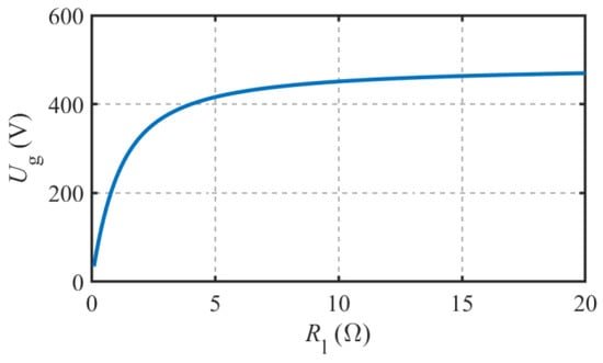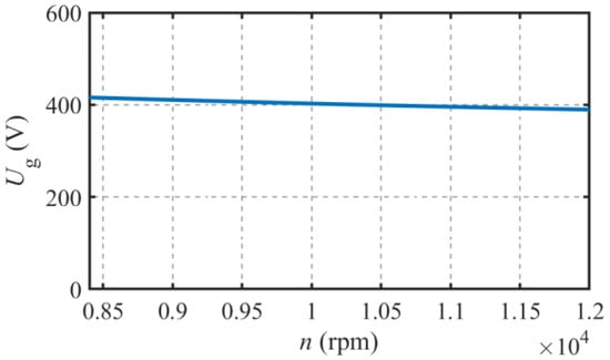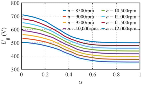 The parameters of the FC are Rs = 50 Ω, Cs = 50 μF, L1 = 0.002 H, L2 = 0.0763 H. The no-load voltage of the generator winding Ug changes with the duty cycle α at various speeds is shown in Figure 22.