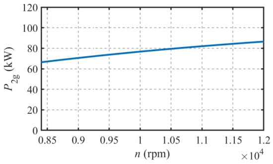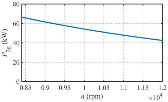The resistive inductive load is connected to the generator winding, and the resistance load Rl = 5 Ω. The external inductance Lc calculated by Equation (11) is connected to the field control winding. The output voltage of the generator winding Ug in load conditions when the speed changes is shown in Figure 11. The value of the Ug keeps constant while the speed rises from 8400 rpm to 12,000 rpm. The output power of the generator winding P2g in load conditions when the speed changes is shown in Figure 12. The value of the P2g decreases while the speed rises from 8400 rpm to 12,000 rpm because reactance increases with the frequency increase and the power factor decrease.