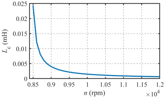 The current and external inductance of the field control winding can be calculated using the above equation. The d-axis current idc is shown in Figure 7 when the speed changes. The amplitude of the idc increases while the speed rises from 8400 rpm to 12,000 rpm. The external inductance Lc is shown in Figure 8 when the speed changes. The value of the Lc decreases while the speed rises from 8400 rpm to 12,000 rpm.