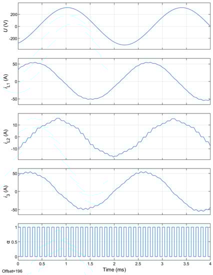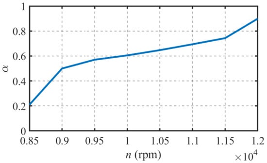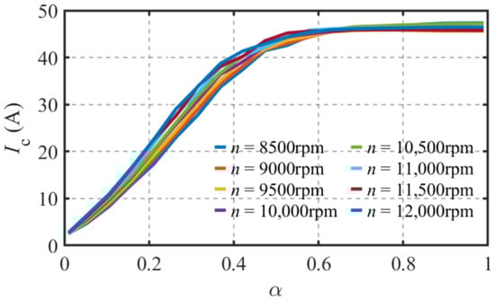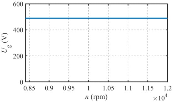 The duty cycle α to keep the voltage of the generator winding Ug = 500 V while the speed from 8400 rpm to 12,000 rpm is shown in Figure 23. The duty cycle α increases from 20% to 90% while the motor speed increases from 8400 rpm to 12,000 rpm.