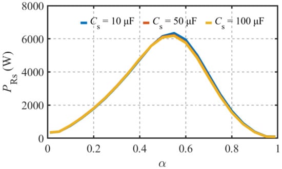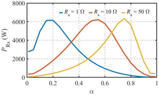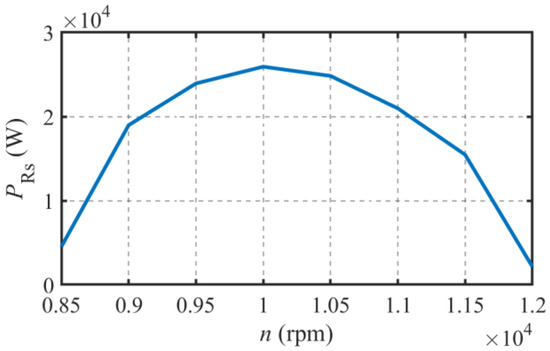 The resistance loss while the speed from 8500 rpm to 12,000 rpm is shown in Figure 27. The resistance loss increases first and then decreases and the maximum of the resistance loss PRs = 26 kW. The current in AC chopper i3 is small so the power of the Rs is small while the duty cycle α is small and the AC chopper is close to the open circuit at low speed. Similarly, the current in AC chopper i3 is small so the power of the Rs is small while the duty cycle α is large and the AC chopper is close to the short circuit at high speed.