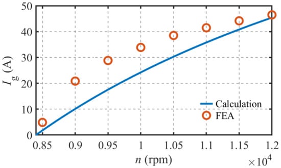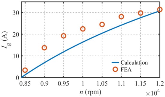 The voltage of the generator winding Ug in load conditions obtained from the circuit simulation is compared with that obtained from the FEA as shown in Figure 28. The control effect of the FC is valid. The current of the field control winding Ic obtained from circuit calculation is compared with that obtained from the FEA as shown in Figure 29. The calculated values and FEA values of Ic are equal at speeds close to 8400 rpm and 12,000 rpm. The FEA values of Ic are greater than the calculated values while the speed is between 8400 rpm and 12,000 rpm.