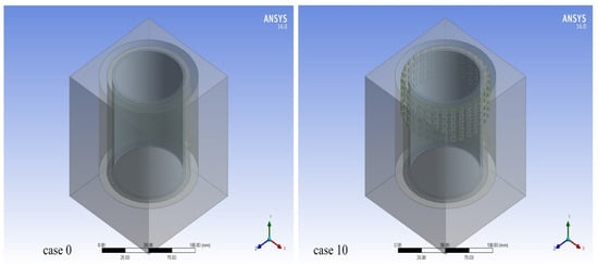 In this section, parameters of square pin fins were varied and discussed in detail. The scheme followed the effect of fin cross-section, effect of fin spacing and effect of height to compute fin effectiveness for each case. An optimal structure was evaluated after detailed parametric study. A single cylinder was considered for the ease of numerical analysis. Square pin fins were introduced in the passage of coolant jacket to enhance rate of heat transfer. Ten cases were studied (i.e., from case-1 to case-10) while a no fin case was assumed as case-0. The isometric view of cylinder block is shown in Figure 4.