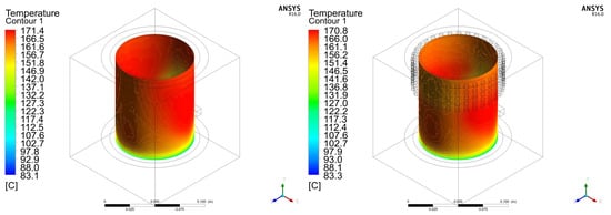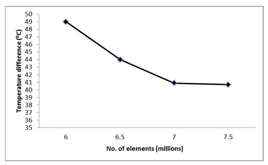 Mesh was considered to be independent when the temperature difference shows no more than 1% of deviation with the number of elements. Results were examined for the temperature difference between water inlet temperature and sleeve inner cylinder wall temperature with varying number of elements. Once the number of elements crossed 7 million, a negligible temperature difference was observed. Therefore, the minimum threshold was set to 7 million for the whole parametric study. Variation of temperature difference versus the number of elements is described in Figure 3.