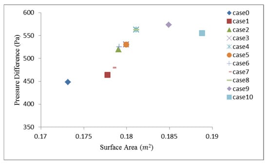 The effect of pressure drop with surface area is shown in Figure 6. With an increase in surface area using fin surfaces, the pressure drop gradually increases. More fins eventually shorten the fin spacing which allows the coolant to pass through them. This in fact causes the blockage in the flow and results in increased pressure drop across inlet to outlet. Minimum pressure drop was observed for case-1 464 Pa while the maximum pressure drop was observed for case-9 as 573 Pa in comparison to no-fin case-0.