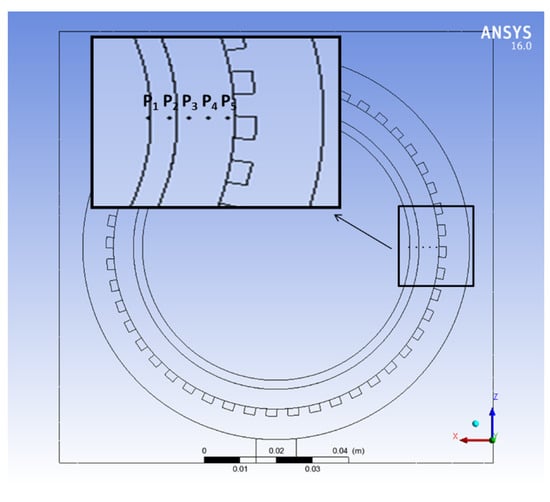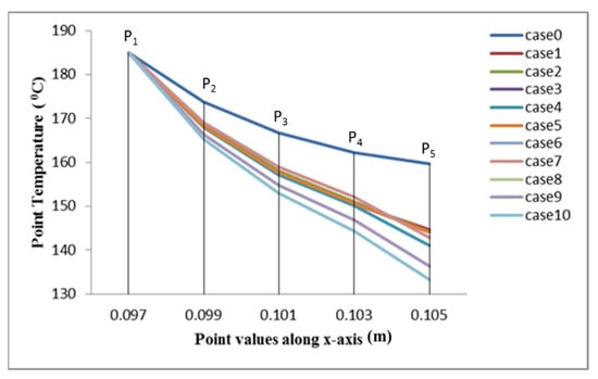 Within an internal combustion engine (IC Engine), the combustion of the air-fuel mixture generates temperatures that can rise as high as 2000 °C, posing the risk of melting the cylinder body and engine head. Inadequate cooling can result in the combustion of lubricating oil, leading to engine part seizure and damage to oil rings and compression rings [31]. The addition of fins shows a significant reduction in internal temperature. Temperature distribution across the wall at TDC is shown in Figure 7. The location of five different points P1, P2, P3, P4, and P5 at vicinity are shown in Figure 8. The inner wall temperature of sleeve was kept constant as 185 °C. The temperature gradually decreases starting from the sleeve inner side up to cylinder outer wall surface. It is evident from the results that for case-0 with no fin, the temperature drop is from 185 °C to 159.6 °C, while for the case-10, maximum temperature drop was observed (i.e., from 185 °C to 133 °C). Maximum and minimum drop in temperature was measured as 26.6 °C and 14.9 °C, respectively, in comparison to case-0.