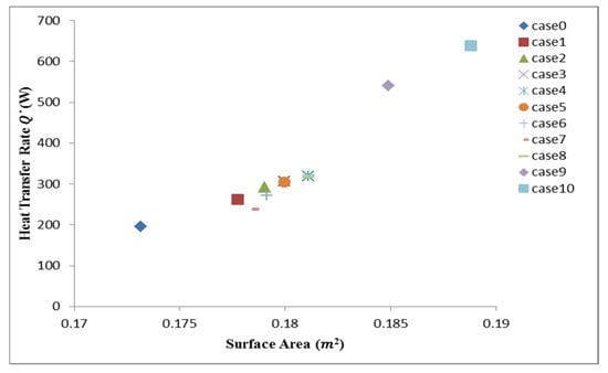 The effect of heat transfer rate with surface area is shown in Figure 10. With increase in surface area using finned surfaces, the rate of heat transfer increases gradually. Case-0 represents a minimal rate of heat transfer with respect to other cases. Case-4 and case-5 show a reasonable enhancement of rate of heat transfer as surface area increases. Case-8 and case-9 provide a fair increment in the rate of heat transfer. Maximum and minimum heat transfer rate was recorded for case-10 and case-7, respectively.