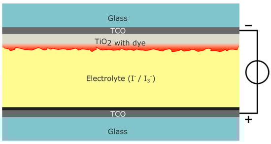 Figure 1 shows the schematic structure of a DSSC, consisting primarily of two electrodes and an electrolyte in between. The generation of electrons occurs in the photosensitive dye that is administered to the surface of the anode (the working electrode). The most widely used configuration of an anode is that of a transparent conductive oxide (TCO) glass (indium or fluorine-doped tin oxide), coated with a mesoporous metal oxide semiconductor like or [14]. Titanium dioxide offers a bandgap of about 3.2 V and is both nontoxic and inexpensive, making it a common choice as the semiconductor material. It is responsible for electron transmission, and therefore, functions better when more of the surface area is exposed. It was the use of the rough surface of a mesoporous layer of instead of a smooth coating that facilitated the breakthrough of Grätzel and O’Regan in 1991 [3]. A thin film of inorganic or natural photosensitive dye is then adsorbed onto the semiconductor layer of the anode. Cells offer flexibility in the choice of dye used. Panchromatic ruthenium complexes are widely preferred for their high PCE. However, natural plant-based dyes, such as chlorophyll and anthocyanins, are also suitable and offer a less toxic alternative. They, however, tend to have a lower PCE [15]. The cathode is also a TCO glass sheet that encompasses the cell. Between the electrodes is also an electrolyte, a solvent containing a reversible redox mediator (often redox couple).