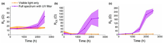 The disadvantage of incorporating UV filters would be the additional cost of production. Furthermore, it is uncertain to what extent UV filters actually limit UV degradation in outdoor conditions. Poskela et al. argued that the commonly used UV filter with a cut-off of 400 nm may not be sufficient for outdoor use [45]. The aging test results of DSSCs exposed to visible light only and DSSCs exposed to the full spectrum including UV light (using xenon lamps) with a UV filter were compared. It was found that after 1500 h of exposure, the PCE of the visible-light DSSC remained largely stable, whereas that of the UV-exposed DSSC decreased to 10% of the initial efficiency, despite the UV filter. In order to determine the reason for this degradation, the electrochemical impedance spectra (EIS) of the tested cells were measured. EIS is an impedance measurement made by varying the frequency of an AC power supply. The different components of the cells respond to different frequencies, for example, the impedance of the TCO-coated electrodes approximates that of an ohmic series resistance. The EIS in Figure 2a shows that this value remains more or less stable for the first 2000 h. Meanwhile, an increase in internal resistance caused by reduced charge transfer (Figure 2b) and diffusion (Figure 2c) contributes immensely to the internal resistance after only 1000 h. This can be explained by the irreversible reduction of iodine. It shows that UV filters may not be sufficient to completely eliminate the adverse effects of UV light on the cell. Choosing a redox pair or electrolytes that do not have the iodide-triiodide redox pair may be a better alternative for longer life.